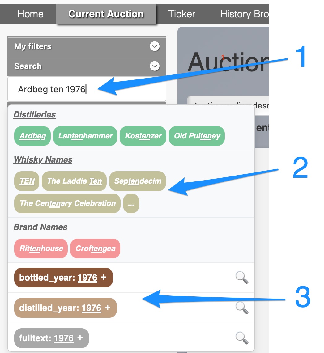 Bitte beachten Sie, dass das Suchvorschlagsfeld nur solche Vorschläge anzeigt, die Sie auch in den bestehenden Filtern zum jeweiligen Zeitpunkt hätten auswählen können. Wenn Sie in einer neuen Suche „Ardbeg 1976“ eingeben, sehen Sie „Ardbeg“ als Brennerei und „1976“ als Optionen für Abfüll- oder Destillationsjahr. Das bedeutet jedoch NICHT, dass es in der aktuellen Auktion tatsächlich eine Flasche Ardbeg aus dem Destillations- oder Abfülljahr 1976 geben muss. Nach dem Klick auf Ardbeg wird das Abfüll- oder Destillationsjahr 1976 daher möglicherweise nicht mehr als gültige Option angezeigt.
